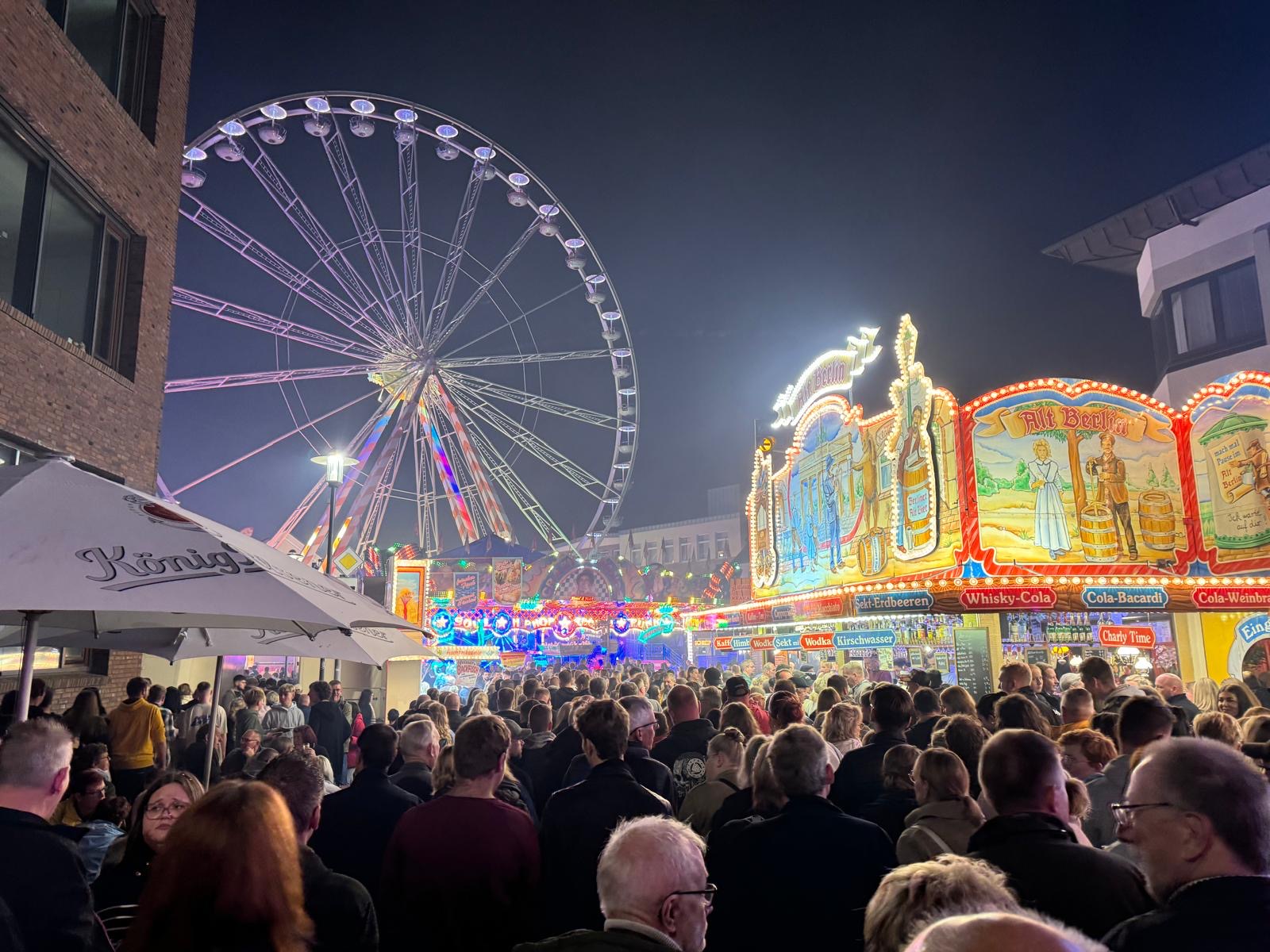 Das Kirmesfeeling wird entfacht durch: Das Kettenkarussell „Fly Over“ hebt seine Gäste in schwindelerregende 40 Meter Höhe und bietet dabei einen grandiosen Blick über die Stadt.