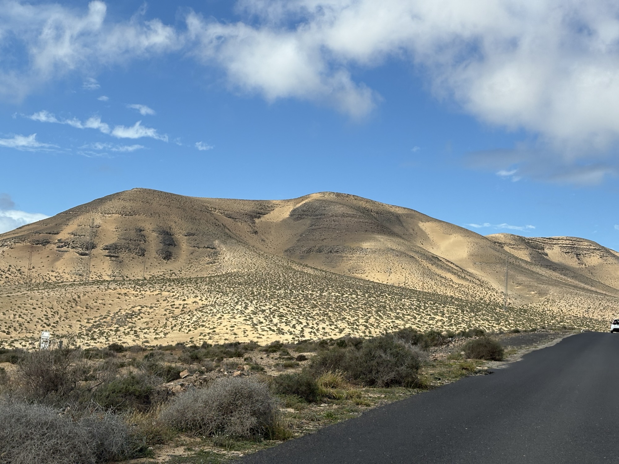 Danach setzten wir unseren Trip fort. Nach Morro Jable stand dieses Mal der Mirador de Cofete auf dem Programm. Dabei handelt es sich um einen Aussichtspunkt in rund 230 Metern Höhe, von dem man den Strand von Cofete sowie den Nordatlantik bestaunen kann. Der Mirador liegt etwa 15 Kilometer von Morro Jable entfernt, tief im Gebirgspfad der Península de Jandía (deutsch: Halbinsel Jandía). Die Fahrzeit wurde mit 30 Minuten angegeben. Ein erster Vorgeschmack auf das, was uns bevorstehen sollte. Denn die Straße durch den Naturpark von Jandía hatte es in sich und war größtenteils nicht geteert. Langsam fahren war angesagt, auch das Auto blieb nicht frei von Schmutz. Auf dem Weg erlebten wir dann einmal mehr die grüne Seite von Fuerteventura. Auf den Bergen sprießten Pflanzen und Büsche und verpassten ihnen einen grünen Anstrich, wie man ihn sonst vor allem auf La Palma oder Madeira erwarten würde.